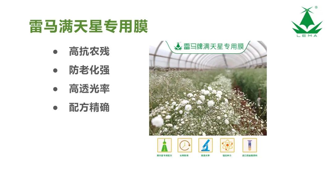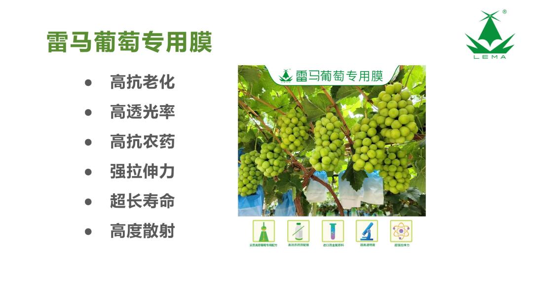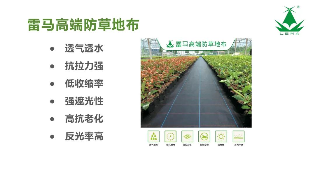 雷馬產(chǎn)品涵蓋農(nóng)用地膜、大棚膜、散光膜、水池布、彩條布、防雨布、遮陽網(wǎng)等,同時以專業(yè)化、精準化、個性化服務于花卉、蔬菜、漿果、馬鈴薯、藥材、果林果樹等經(jīng)濟作物種植及農(nóng)場養(yǎng)殖現(xiàn)代設施農(nóng)業(yè)領域?qū)S卯a(chǎn)品的定制服務,提供專業(yè)化種植技術(shù)解決方案。